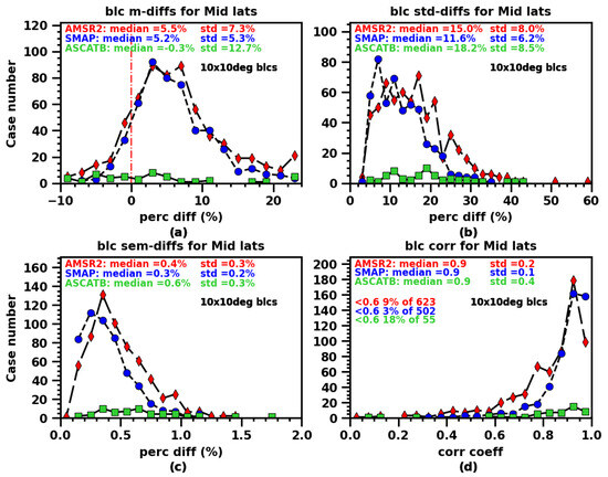 In Figure 6b, the STD of the percent differences within a block ranges from 17 to 20%, which exceeds the MPDs by far, indicating considerable variability across pixels within each block for all three radiometers. The spread of the histograms ranges from 5 to 15%, reflecting substantial variability across blocks, again with SMAP exhibiting the widest range. Figure 6c shows that the SEM remains 10 times lower than the MPD in all cases, pointing to statistically significant MPDs.