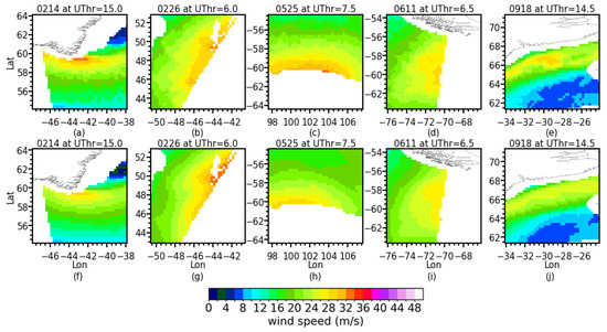 AMSR2 maps (top) and CCMP maps (bottom) at coincidences for the five selected high spatial correlation cases in the mid-high latitude region, based on the results in Figure 10.