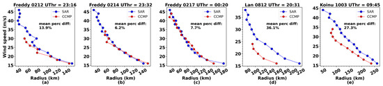 In line with earlier comparisons, Figure 16 shows the SAR and CCMP maps with the highest spatial correlations. All five pairs indicate dominantly stronger winds within the SAR-captured TCs. Notably, the SAR data reveal weaker winds in the surrounding regions, a feature that might also be present in the radiometer comparisons but not as clear. Despite its more than 10 times higher spatial resolution, SAR also does not consistently capture distinct low-wind eye centers, and this is not due to resampling onto a coarser grid.