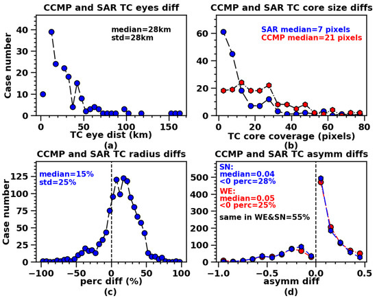 Figure 19d presents the histograms of west–east and south–north asymmetries. When the asymmetries align between SAR and CCMP, the distribution approaches a zero difference with a median of 0.05, relatively to the maximum at 0.5. In 75% and 72% of cases, SAR and CCMP exhibit aligned asymmetries in either orientation. When the asymmetries do not agree, the absolute differences could reach up to 1.0. This occurs when all pixels are located in the west (frac_w = 1.0) in SAR, while in CCMP, they are all in the east (frac_w = 0.0). Notably, in only about 55% of cases do the SAR and CCMP TCs show simultaneous agreement in both west–east and south–north asymmetries, suggesting that SAR and CCMP wave-1 structures (relative to each TC eye center) do not align in phase nearly half of the time.