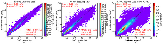 Figure 20 shows scatter plots comparing SAR data to model predictions, to illustrate the performance of the trained RF model. Among the legends in Figure 20, the error represents the mean absolute difference across all pairs of relevant ocean pixels, irrespective of tiles or timeframes. The bias is the mean difference over all pixels used; the RMSE is the square root of the sum of the bias squared and the variance. The correlation coefficient is derived from all pixel pairs in arbitrary order, without considering spatial or temporal dependencies. Accuracy is determined as 100 minus the median percentage absolute error. For individual percentage absolute errors, the SAR measurement serves as the denominator instead of the mean of SAR and CCMP, as SAR measurements are considered the true state. The total set of TCs named above is divided into training and testing sets at a 75 versus 25% split. The latter is also a blind TC set that will be used to fully test the RF model’s potential to correct individual TC stances. When training the RF model with the training TC set, a similar 75% versus 25% split is applied, with 75% of pixel pairs used for model training.