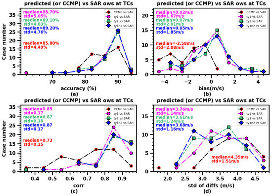 Histograms of the statistics when the RF model is applied to the individual TC tiles in the blind set. In each panel, the comparison between different curves illustrates the improvement in the predicted ocean wind speed maps relative to the CCMP maps, assuming that the SAR maps are considered the true states, in terms of accuracy (a), bias (b), correlation coefficient (c), and STD of the differences (d).