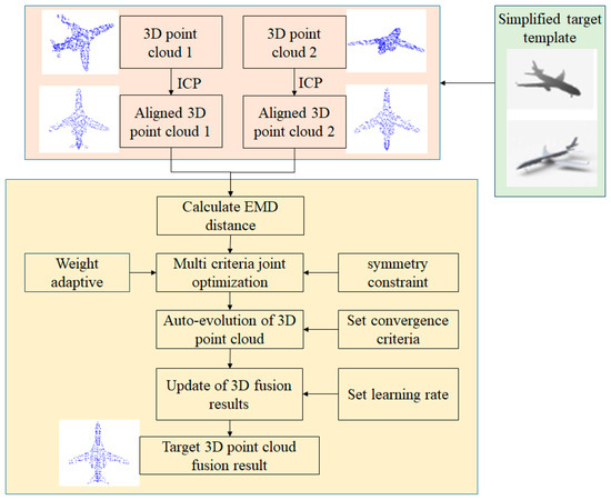This work uses to represent one target 3D point cloud a reconstructed from a set of SSIs and to represent the same target 3D point cloud b reconstructed from a different set of SSIs. The fused target 3D point cloud is denoted by . For the fusion algorithm, it is essential not only to effectively reflect the geometric structure of the target at the current moment but also to preserve the original geometric structure of the target. Given that the EMD can effectively measure the dissimilarity in the geometric structure of point cloud, a point cloud dissimilarity measurement method based on EMD will be embedded into the fusion algorithm to ensure the structural similarity between the fused point cloud and the input point cloud. Additionally, due to the limited observation perspectives of SSIs, the target point cloud obtained from satellite observations may contain points with low confidence. To prevent low-confidence outlier points from adversely affecting the 3D fusion of the target, it is necessary to eliminate these outlier points as much as possible during the fusion process. Therefore, this paper proposes an EMD auto-evolution point cloud fusion method, which gradually approximates the geometric structure of the target point cloud during the evolution process and effectively reduces the influence of potential outlier points in the point cloud on the fusion result, based on the EMD measure. The final output is a preliminary fusion result with high confidence. The framework of proposed method is illustrated in Figure 1.