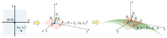 Firstly, the local neighborhood of a point in 3D space is parameterized into a 2D domain using the differential mapping , where and represent a point in the 2D domain (as shown in Figure 2). The Jacobian matrix provides the best first-order approximation of the mapping , where and are the tangent vectors defining the first fundamental form [27]. The normal at point can be calculated using the cross product . For any point , since , it can be proven that point lies on the tangent plane of point . This allows a point in the 2D domain to be mapped to a point on the tangent plane of a point in 3D space. Furthermore, we use the augmented Jacobian matrix to calculate the normal and point . Finally, the distance between a point on the tangent plane and its corresponding point in 3D is given by , where and are the principal curvatures at point , which are the eigenvalues of the second fundamental form. With this, we can reconstruct the local geometric relationship of point in the 2D parameter domain. In other words, based on the local neighborhood parameterization of , any point in the 2D space can be correspondingly mapped to a point in the 3D space.