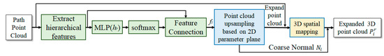 Since the locally expanded point cloud on the 2D parameter plane is located on the tangent plane, it needs to be moved onto the target surface (typically a curved surface) and its normals updated. Specifically, each point in the point cloud is displaced along its normal by a distance . This distance is calculated by regressing the features of each point connected with the coarse coordinates, as follows: