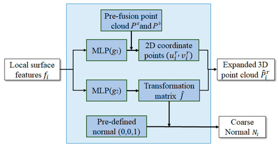 In this module, we expand the input point cloud by R times. By regressing the obtained multi-scale features, a coarse dense point cloud and the corresponding coarse normals are generated. Specifically, the expansion process consists of two steps: first, adaptive upsampling is learned in the 2D parameter domain; then, the results are projected into the 3D tangent space through a learned linear transformation. The process is illustrated in Figure 4.