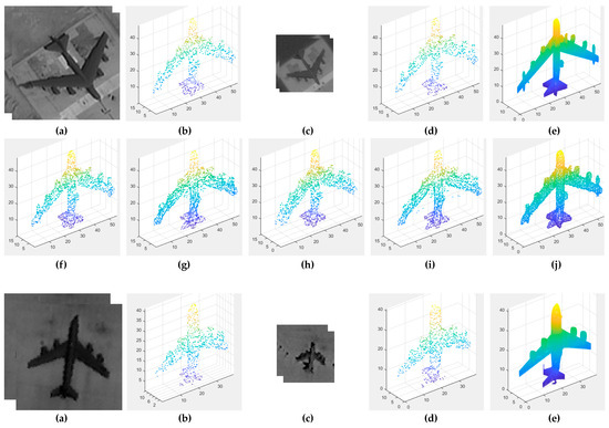 3D point fusion results of different methods in dataset A. (a) the first SSIs; (b) 3D point cloud reconstructed from the first SSIs; (c) the second SSIs; (d) 3D point cloud reconstructed from the second SSIs; (e) ground truth; (f) ICP; (g) 3DT; (h) DCP; (i) MS3DQE-Net; (j) proposed method.