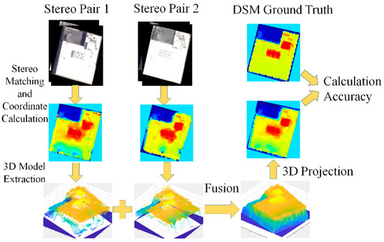 Since there is no publicly available dataset for satellite-based 3D data fusion, we indirectly validated the fusion performance of our proposed method using a set of publicly available datasets for stereo matching and DSM fusion. Specifically, as shown in Figure 7, we perform stereo matching and coordinate calculation on two sets of stereo image pairs to obtain DSMs. Then, we extract the 3D models of building targets from each DSM and fuse the point clouds. The fused result is reprojected into a DSM and compared with the DSM ground truth provided in the dataset. This method allows us to indirectly validate the effectiveness of the fusion method by evaluating the accuracy of the fused point cloud in the height dimension. The stereo matching and coordinate calculation are achieved through the method proposed in reference [31].