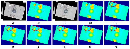 DSM projection of 3D fusion results using different methods in dataset B. (a) The first SSIs; (b) DSM obtained from the first SSIs; (c) the second SSIs; (d) DSM obtained from the second SSIs; (e) ground truth; (f) ICP; (g) 3DT; (h) DCP; (i) MS3DQE-Net; (j) proposed method.