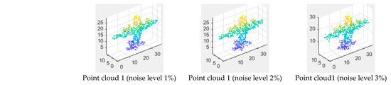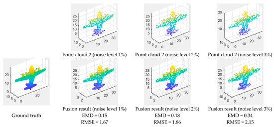 To verify the robustness of the algorithm, Gaussian noise at different noise levels was added to the point cloud obtained from SSIs, referred to as point cloud 1 and point cloud 2. The proposed fusion algorithm was then applied to fuse the two noisy point cloud. The fusion results are shown in the figure below.