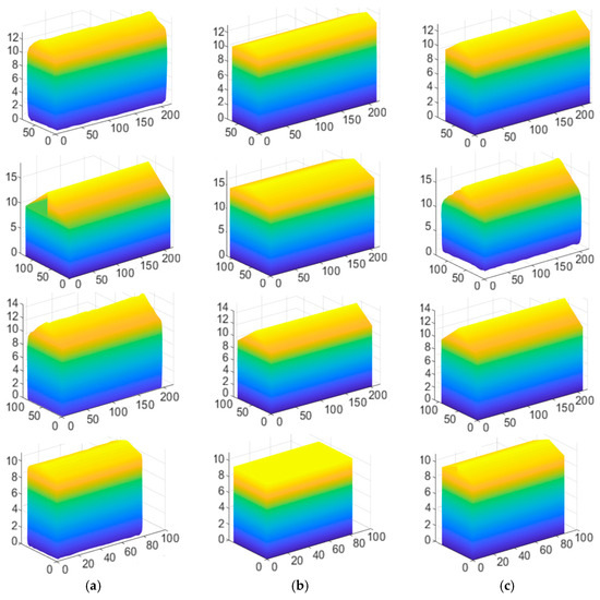 The fusion result of 3D data obtained from optical and SAR data sources. Corresponding to buildings 1–4 from top to bottom. (a) Optical reconstruction result; (b) SAR reconstruction result; (c) fusion result.