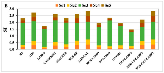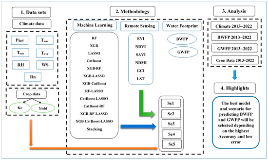 The workflow of input data, applied machine learning models, scenarios, and expected output is represented in Figure 2, which includes the collection of climate and crop data as the initial step. Subsequently, four machine learning models (XGB, RF, LASSO, and CatBoost) were individually employed, along with hybrid and stacking ensembles, integrating remote sensing indices such as EVI, NDVI, SAVI, NDMI, GCI, and LST to predict the blue and green water footprints based on five distinct scenarios combining climate, crop data, and remote sensing indices.