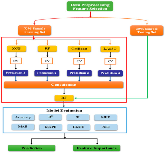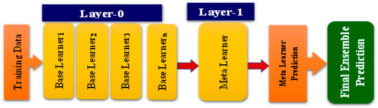 Stacking, an ensemble technique, integrates diverse classification models through a meta-classifier, as highlighted by Verma and Pal [61]. The fundamental concept behind stacking is to amalgamate multiple weak learners to create a model with superior generalization capabilities, as discussed by Jiang, Liu [62]. This innovative ensemble framework in ensemble learning leverages meta-learners to merge outcomes from individual base learners [63], with the first-level learners being referred to as base learners and the combinators as second-level learners or meta-learners, as illustrated in Figure 3.