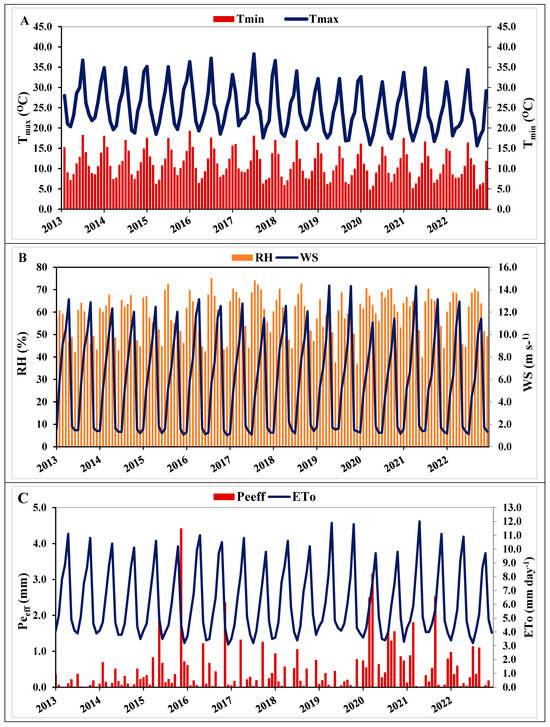 This research used monthly recordings of the maximum and minimum air temperatures (Tmax and Tmin in degrees Celsius), wind speed (WS in meters per second), relative humidity (RH in percentage), and precipitation (P in millimeters) gathered from 2013 to 2022. Additionally, data on solar radiation (SR) and vapor pressure deficit (VPD) were acquired from the Central Laboratory for Agricultural Climate at https://www.arc.sci.eg (accessed on 1 January 2023). The dataset covers a significant period from 2013 to 2022, providing a comprehensive understanding of the climatic conditions over the years, essential for various environmental and agricultural analyses and applications.