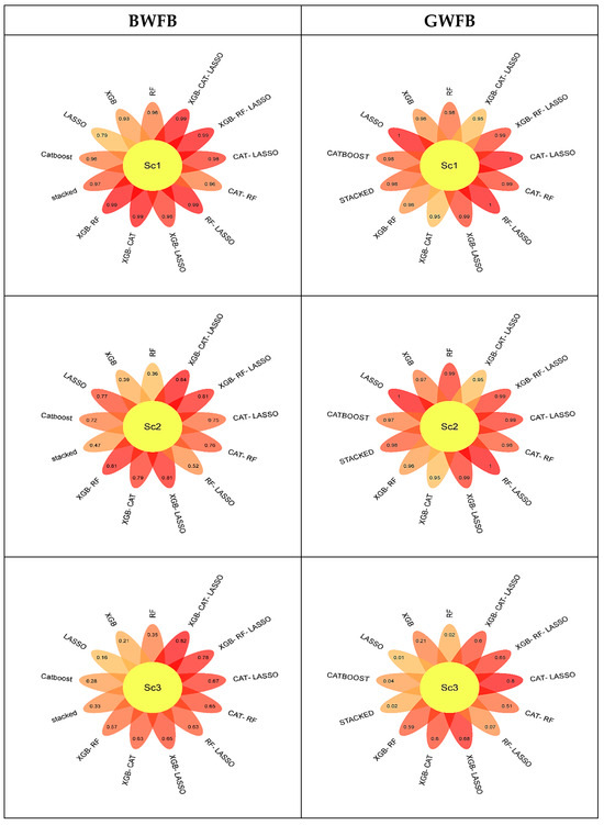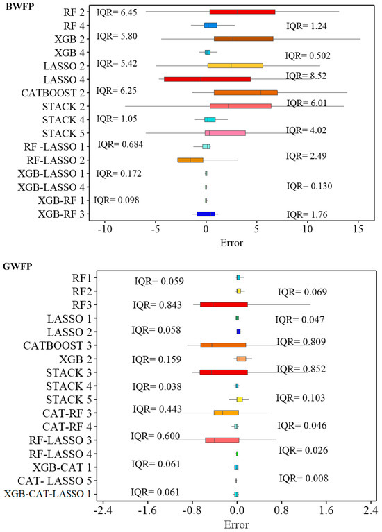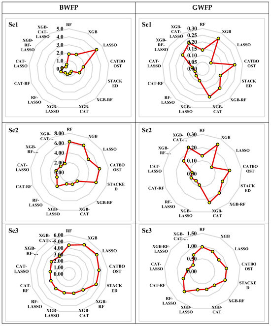 Hybrid prediction models strategically merge various algorithms to leverage the specific benefits of different techniques, resulting in more precise estimations compared to alternative models, as discussed by Xu, Peng [57]. The current research expanded upon prior studies by introducing additional models, totaling eight hybrid models, either double or triple, to determine the most optimal models and scenarios for predicting BWFP and GWFP between 2013 and 2022. These hybrid models consisted of XGB-RF, XGB-LASSO, XGB-CatBoost, RF-LASSO, CatBoost-LASSO, CatBoost-RF, XGB-RF-LASSO, and XGB-CatBoost-LASSO.