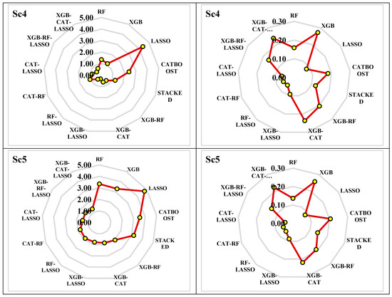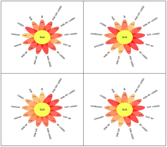 Li, Wang [79] proposed an innovative stacking technique aimed at integrating information from multiple growth stages to enhance the predictive capability of the winter wheat grain yield (GY) model. The stacking approach yielded more information that is consistent and improved prediction accuracy compared to individual fertility results, as evidenced by an impressive R2 value of 0.74. During the model validation phase, the R2 values witnessed significant enhancements of 236%, 51%, 27.6%, and 12.1%, respectively. A comparison of research outcomes illustrated that the stacked ensemble model achieved the highest and lowest R2 values in predicting wheat BWFP under Sc4 (incorporating Peeff, Tmax, Tmin, and SA) and Sc3 (utilizing remote sensing indices) at 0.98 and 0.33, respectively. Similarly, for forecasting wheat GWFP, the highest and lowest R2 values were observed at 0.99 and 0.02 under Sc4 and Sc3, respectively.