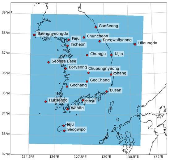 In this study, we used LINET and the GK2A/AMI data for 20 lightning cases between June and August in 2020 and 2021. LINET, introduced and operational since 2014, observes the lightning type, polarity, intensity, time of occurrence, and location using the Time of Arrival (TOA) method with signals in the Very Low Frequency (VLF)/Low Frequency (LF) and Very High Frequency (VHF) ranges []. This method is different from the Time of Group Arrival (TOGA) method used by the World-Wide Lightning Location Network (WWLLN) [] and the Arrival Time Difference (ATD) method used by the Sferic Time and Ranging Network (STARNET) []. Currently, LINET observes lightning at 21 observatories across the Korean Peninsula (red dots in Figure 1), and the detection efficiency is over 95% across the Korean Peninsula and the adjacent seas []. GK2A observes every 10 min and has 16 channels []. In this study, the Brightness Temperature (BT) of the infrared (IR) 8, 11, 13, and 14 channels (6.3 μm, 8.7 μm, 10.5 μm, and 11.2 μm) were used, with the IR 8 used as the upper-level Water Vapor (WV) channel. The spatial resolution of all the channels used is 2 km. In this study, considering the observation efficiency of LINET, the analysis area was set as shown in the light blue area of Figure 1. The sources of the two datasets are the KMA and the National Meteorological Satellite Center (NMSC), respectively.