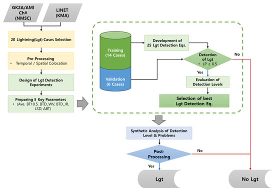 Although various lightning studies have been conducted domestically and internationally, the detection and prediction levels still need to be improved, and research on lightning using satellites is very limited on the Korean Peninsula. Additionally, because the Korean Peninsula is located in the mid-latitudes, it is unsuitable for utilizing the Lightning Imaging Sensor (LIS) of the Tropical Rainfall Measuring Mission (TRMM), which observes between 35°N and 35°S. Additionally, the observation period of TRMM/LIS has limitations in monitoring lightning occurring at random times in detail []. In East Asia, the Geostationary Lightning Mapper (GLM) onboard GOES-16 is not operationally utilized [,]. Therefore, research on lightning detection and prediction using geostationary satellites is necessary.