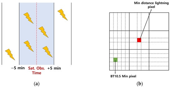 This study was conducted following the sequence shown in Figure 2. First, since LINET provides data on lightning occurrences at arbitrary times and locations, while GK2A provides spatiotemporally regular gridded data, spatiotemporal matching was necessary to use both datasets together. There is no established optimal spatiotemporal matching criterion between ground-based lightning detection sensor data and satellite data, so various criteria have been applied. For example, Lee et al. [] set the threshold criteria to ±5 min and a radius of 5 km. Météo-France [] used spatiotemporal matching criteria of −15 to +5 min and a radius of 35 km. In this study, we performed spatiotemporal collocation using the method shown in Figure 3. Temporally, lightning that occurred within ±5 min of the satellite observation time was considered the same lightning event. Spatially, based on the nearest satellite pixel to the lightning occurrence point (the red pixel in Figure 3), the pixel with the lowest BT10.5 (BT of the 10.5 μm channel) within a 15 × 15-pixel area was defined as the convective pixel (ix, jy) that caused the lightning (the green pixel in Figure 3). This value was set to account for cases where lightning does not occur directly under the convective cell. Because the spatiotemporal collocation criteria are very important in lightning detection, we performed a simple sensitivity experiment on these criteria and the results are presented in Section 4.