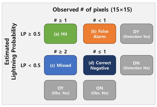 Since lightning is a binary variable distinguished by whether it occurs, the detection performance was evaluated based on a contingency table (Figure 4). The performance evaluation indices used were Probability Of Detection (POD), False Alarm Ratio (FAR), Bias, Kuiper Skill Score (KSS), and Heidke Skill Score (HSS) (Equations (7)–(10)). According to Doswell et al. [], HSS is superior to the Critical Success Index (CSI) in evaluating rare extreme events such as lightning or tornadoes. Therefore, this study used HSS for the evaluations.