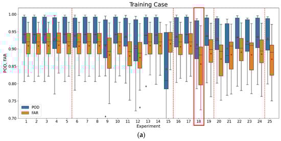 In Figure 5 and Table 3, except for some Exps, the POD and FAR for all Exps were higher than 0.85. The long length of the boxes in the box plot indicates that the lightning detection performance varied from case to case. When comparing the detection performance between the training cases and validation cases, the variability in detection performance was greater in the validation cases. This is likely related to the fact that the lightning count was lower in the validation cases compared to the training cases, as shown in Table 1.