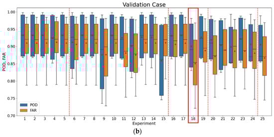 Box plots of lightning detection evaluation levels for the 25 Exps ((a) training and (b) validation cases). The red dots represent the average evaluation indices of the cases for each experiment. The red dashed lines divide the Exps based on the number of IVs. Red boxes show Exp 18, which had the best result among the 25 experiments.