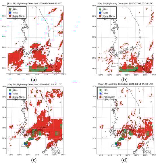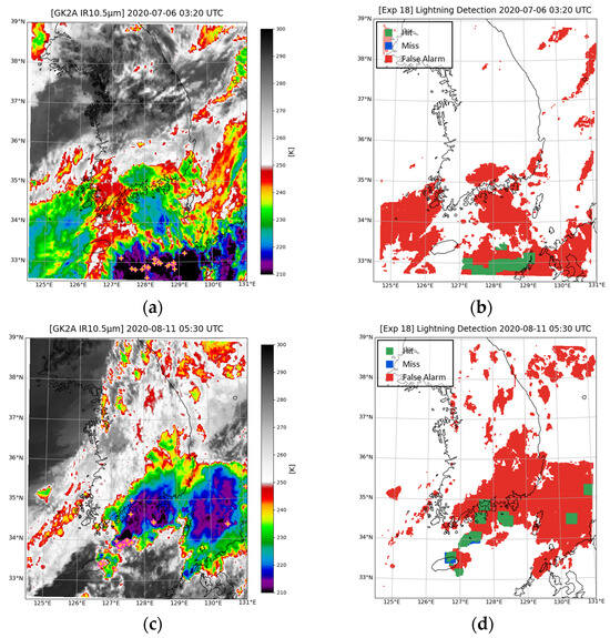 Sample images of (a,c) BT10.5 distribution with lightning occurrence points (yellow cross markers) and (b,d) lightning detection results from Exp 18. (a,b) There were fewer lightning occurrences at 03:20 UTC on 6 July 2020. (c,d) Intense lightning occurrences at 05:30 UTC on 11 August 2020.