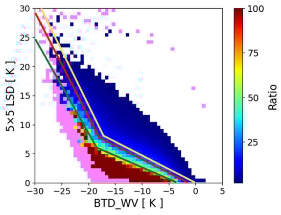 In Figure 7, the redder the distribution, the higher the of false detection. The pink region is where Equation (11) has a zero denominator and a non-zero numerator (Hit count = 0; False Alarm count ≠ 0). Most false-detection pixels were concentrated where the was approximately −6 K or lower, and as the negative increased, the of the false-detection pixels also increased. This suggests that the main causes of false detections are convective clouds with high roughness in their early development, cloud edges, or anvil clouds with low roughness at the cloud top.