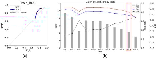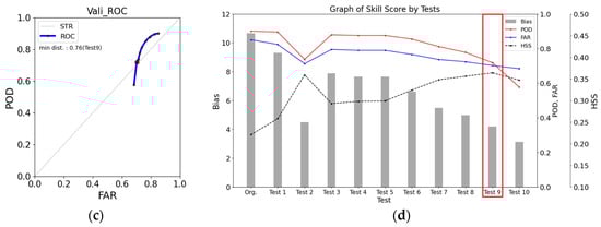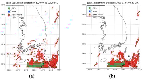 As a result of the sensitivity test, for Exp 18 (Figure 8), it was shown that applying Test 9 resulted in the best detection performance. The post-processing area for Test 9 is below the red line in Figure 7. As a result of the post-processing, the decrease in FAR was greater than that for the POD, and the HSS improved by approximately twofold. In particular, the Bias improved by more than threefold. This is also shown in the post-processed lightning detection images (Figure 9), where many areas of anvil clouds or immature clouds were removed.
