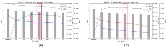 Results of the RG post-processing sensitivity test for the (a) training cases and (b) validation cases. The red box indicates that the Skill score for the threshold pixel (Ref_pixel) was 90, representing the final applied threshold value.