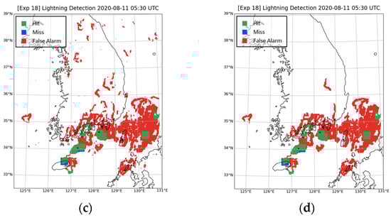 Figure 6a,b shows sample images of the BT10.5, lightning distribution, and lightning detection results from Exp 18 on 6 July, 2020, at 03:20 UTC. In this case, the lightning was triggered by a low-pressure system accompanying a stationary front, with only 26 lightning strikes at the selected time. Figure 6c,d shows images from 11 August 2020 at 05:30 UTC, where the lightning was caused by atmospheric instability due to the advection of warm, humid air in the lower levels and cold, dry air in the upper levels, resulting in 103 lightning strikes at the selected time. Comparing the lightning detection results (Figure 6a,c) with the lightning strike locations (yellow markers in Figure 6a,c), the lightning strikes were strongly detected, but the red areas were widely distributed. These areas mainly corresponded to anvil clouds extending around convective cells or upper-level clouds with a low BT. Therefore, this study designed statistical and RG post-processing methods to improve the detection performance.