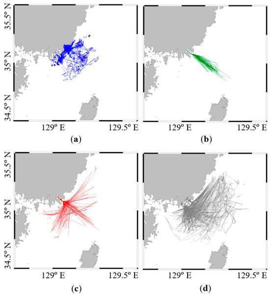 Trajectories of different ship types from the training dataset shown in Table 1. (a) Fishing boat, (b) passenger ship, (c) container ship, and (d) other ship.