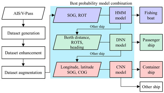Thus, in this study, we propose a method to classify the ship type based on different ship trajectory features and utilized multiple deep-learning and statistical-based techniques to achieve higher accuracy. In the case of AIS/V-Pass, a dataset suitable for each model was created using data generation, enhancement, and augmentation techniques, and this dataset was divided into training and testing sets. A model was created with the training dataset, and the results were verified with the test dataset. Each ship type classification model was applied sequentially, and a total of four types of ships were classified, which include fishing boat, passenger, container, and other ship.