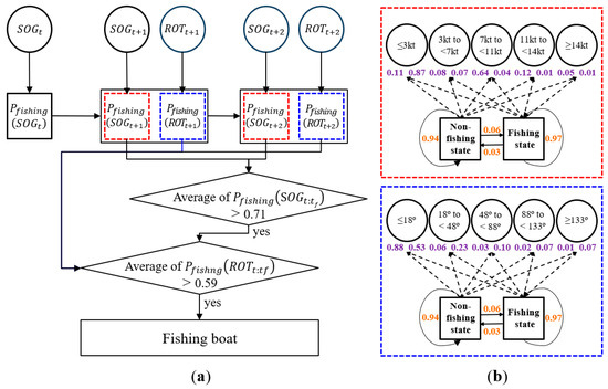 Both parameters were effectively processed by the respective HMMs, and the probability of being in either a fishing or non-fishing state was calculated for each position. Figure 4a illustrates the detailed construction of the first HMM for deriving Pfishing (SOG). Firstly, emission probabilities from the training dataset that had already been trained and processed SOG data were used to calculate the Pfishing (SOG) probability (hidden state). The probability was also influenced by the transition probability, which took into consideration the relationship between t and t + 1, and the fishing or non-fishing state was ultimately determined by the statistical combination method with both results of hidden state probabilities. Particularly, the SOG parameter is recognized as the HMM model’s preferred option for predicting the fishing state [11,31].