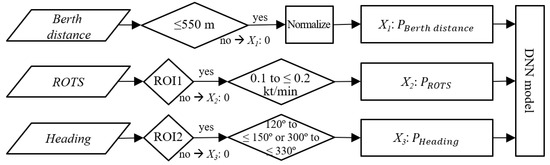 In this study, the navigation of passenger ships along the fixed Busan–Japan route was analyzed in comparison to other ship types. The heading was chosen as the most suitable parameter for this constrained trajectory. Additionally, the distance from the ship to the berth location was estimated and used as a parameter, since passenger ships could commonly only berth at a single pier in the Busan port. Finally, the ship’s ROTS was also incorporated as a parameter to account for the passenger ship’s superior maneuvering capabilities relative to other ship types. To further improve model performance, spatial filtering (ROI filtering) was applied to each parameter. In particular, ROI1 was designated around the entrance to the Busan port for the ROTS parameter, while ROI2 was designated in the open sea for the heading parameter. As demonstrated in Figure 5, specific conditions were applied to each parameter instead of using all trajectory values as learning inputs to better emphasize their characteristics. The berth distance threshold was established at 550 m, corresponding to the measured length of the pier. In ROI1, passenger ships displayed a significant reduction in SOG near the breakwater compared to other ship types. Consequently, a ROTS threshold of 0.1 to 0.2 knots per minute was determined as optimal for identifying passenger ships. Furthermore, distinct heading angles of 120° ≤ 150° or 300° ≤ 330°, which are typical for the Busan port–Japan route, were used to refine the classification.