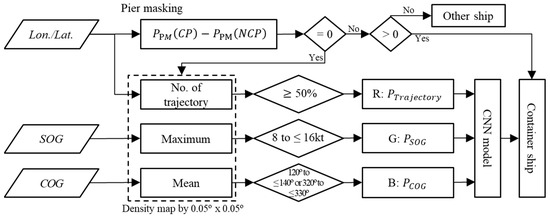 The CNN model includes individual layers for image input, output, flattening, fully connected, and output scoring, as well as iterative layers for convolution, activation, and max-pooling processes [16]. It receives input data in the form of a two-dimensional array, generally referred to as an image, typically consisting of three RGB channels. The input image is represented as col × row × channel (density map). However, the format of trajectory data was point-based, so a conversion process was necessary to render them into 3D data with multiple channels. Consequently, the longitude range of 128.5 to 130.0 degrees and the latitude range of 34.5 to 35.5 degrees were designated to define the outline of the resulting 3D image’s col × row dimensions. To create data for each channel, we assigned SOG to the R band, COG to the G band, and the number of trajectories to the B band. Additionally, we applied particular criteria to capture each parameter’s characteristics in a way that’s identical to the passenger ship classification approach. For Lon/Lat’s trajectory count, we filtered grid cells with over 50% average counts of trajectory to reduce noise. Besides, a threshold for SOG values (8 ≤ 16 kt) was established, considering the relatively faster speed of container ships. Additionally, the COG range (120° ≤ 140° or 320° ≤ 330°) was constrained to highlight the characteristics of container ships primarily navigating to and from the Busan port.