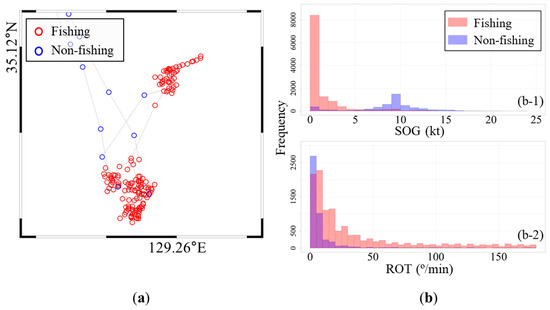 Case application of the HMM model and fishing boat trajectory feature analysis from the training dataset. (a) Labeling of classified trajectory into fishing (red circle) and non-fishing (blue circle). (b) Comparison of SOG and ROT distributions between fishing and non-fishing states.