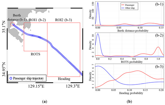 Data from observed passenger ships between 6 and 9 February 2021 were utilized to comprehend the passenger ship trajectory features. Moreover, they were employed to depict movement near berthing locations and show trends in SOG and COG for different ROI areas. Figure 8 depicts the paths of a typical passenger ship, covering the ROI areas. When they reach the Busan port within ROI1, there are likely to be noticeable SOG changes due to their readiness to pass the narrow breakwater. Furthermore, they maintain a steady heading while entering Busan from Japan, encompassing ROI2. In the entire training dataset, when comparing passenger ships to other ships regarding berth distances, passenger ships exhibited several center points over 0 in broadly expanded distributions caused by specific small kinds of datasets, while other ships tend to display probabilities converging towards 0 (Figure 8b(b-1)). Particularly, the ROTS probability trend shows an obvious distinction between passenger ships and other ships, which parameters could be efficient to model performance. When referring to the third parameter, heading probability, there is a variance between the two types of vessels: other vessels exhibit higher densities when the probability is under 0.05, whereas passenger ships display higher probabilities when the probability is over 0.05 (Figure 8b(b-3)).