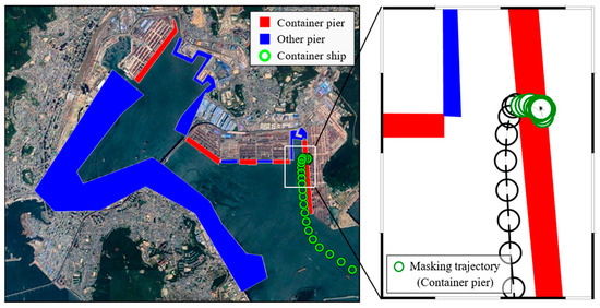 After classifying fishing boats and passenger ships, the pier masking method and CNN model were used to classify container ships and other ships using the remaining ship datasets as input. As the initial step of pier masking, distinct piers for container ships and other vessels in the Busan port were identified. Cargo-specific pier data from the Busan Port Authority (BPA) was referred to, and the shape of shipments at different pier locations was visually verified using Google Earth imagery. Then, for the locations of the indicated piers, polygons for CP (red area) and NCP (blue region) were created, as shown in Figure 9. The green symbol represents the trajectory of a ship entering the Busan port, indicating its entry into the CP area. Consequently, the CP probability for the sample ship was calculated with a value greater than zero (the green circle in the right map), while the NCP probability was assigned a value of 0. Therefore, since the CP probability minus the NCP probability yielded a positive value, the sample ship was classified as a container ship.