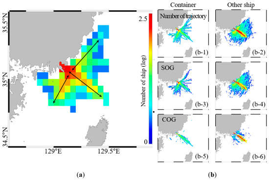 Analysis of container ship trajectory features from the training dataset. (a) Container ship density map in log scale and main navigating direction (black arrows). (b) Comparative analysis between container ships and other ship types using the three RGB inputs, composed of ship trajectories (b-1,b-2), SOG (b-3,b-4), and COG (b-5,b-6), respectively.