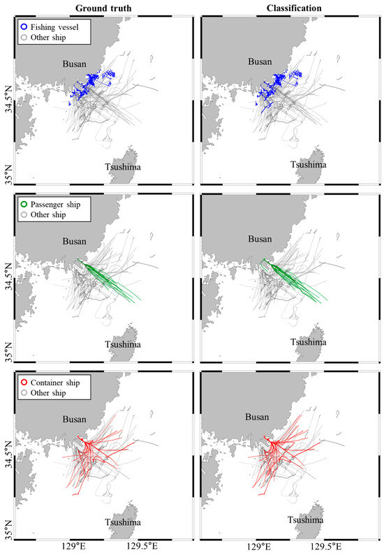 Figure 11 illustrates the independent application of the HMM, DNN, and CNN models, depicting the ground truth and classification results. The HMM-based fishing boat classification is represented by blue circles, the DNN-based passenger ship classification by green circles, and the CNN-based container ship classification by red circles. The test dataset included trajectory information for 203 ships. After applying the HMM, DNN, and CNN models, 54 ships were classified as fishing boats, 55 as passenger ships, and 51 as container ships.