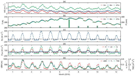 Monthly averaged diurnal cycles of wind speed (a) and (b) temperature at the 2 m, 8 m, and 47 m levels. The precipitation is also included in (b), net radiation in (c), and heat fluxes in (d) at the 47 m level, and TKE, and the height of UBL (e) in 2016.