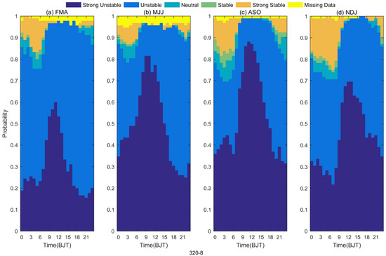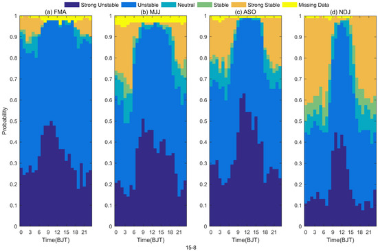 Seasonal average diurnal cycle of the probability of different stability regimes based on the (estimated at the 15–8 m height interval) during different seasons, spring (a), summer (b), autumn (c), and winter (d) in 2016. FMA = February, March, and April; MJJ = May, June, and July; ASO = August, September, and October; NDJ = November, December, and January.