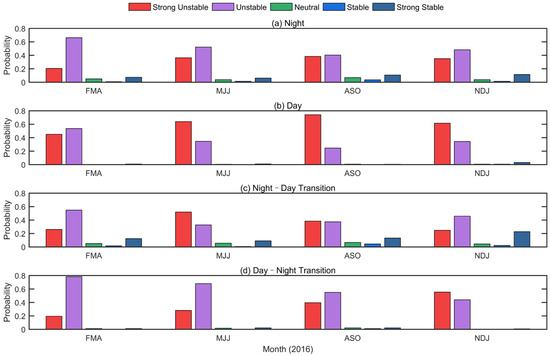 Seasonal average probability of different stability regimes based on the (estimated by the 320–8 m height interval) during four episodes: night (a), day (b), night-to-day (c), and day-to-night (d) in 2016.