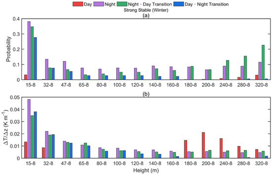 In order to explain the difference in probability between various episodes for the strong stable regime mentioned above, the probabilities of the strong stable regime and temperature differences for the strong stable regime cases between all of the 14 different height intervals, winter for instance, are described in Figure 6. Consistent with results presented earlier in Figure 4, it is evident from Figure 6 that the probability of the strong stable regime during winter approached nearly 30% for the day-to-night episode, and exceeded 35% for both the night and night-to-day episodes at 15–8 m with K m−1, while it was lower than 20% for the other height intervals, with < 0.02 K m−1 in the day-to-night episode. Especially for the upper levels, surface inversions were rarely observed during the day-to-night transition episode. This means the ground-level inversion depths were typically very shallow and lower than 100 m even under very stable conditions at this urban site during the day-to-night transition episode. Yu et al. (2023) [34] reported that an evident early morning temperature inversion was observed in the 1980s below 80 m during winter and 32 m in the 2000s in Beijing. In our case study, only the 15–8 m height interval exhibited a relatively high frequency of surface temperature inversions, suggesting the increasing density of urban buildings has progressively weakened stability within the surface layer. The occurrence of strong stable regimes was more frequent at night compared to those occurring during night-to-day transitions across height intervals from 15–8 m to 160–8 m, and conversely for other height intervals, indicating thick surface inversions mostly occurred around sunrise in winter. Interestingly, the presence of a strong stable regime was also noted during the daytime episode, consisting with the findings from Figure 5. Moreover, slightly stronger ( K m−1) and thicker surface inversions were identified as well. A further study is made in Section 3.3.