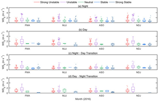 For the remainder of this study, we analyzed the characteristics of several variations according to the stability regimes defined by the 320–8 m height interval. This height range effectively captures the bulk state of the UBL from surface levels up to 320 m, which can also avoid some complex flow at lower levels over complicated surface conditions [35]. The WS ranges at both 8 m and 47 m for each stability regime across different episodes and seasons are presented in Figure 7 and Figure 8, respectively. Generally, wind distribution patterns for different stability regimes during all four episodes and seasons were similar for both 8 m and 47 m. The stability increased as wind speed decreased, and mostly the strong stable and strong unstable regime predominantly occurred during very weak wind, about 0.6 m s−1 for the 8 m level and 1.1 m s−1 for the 47 m level during the night and night-to-day episodes for the mean of wind speed in four seasons, and around 0.9 m s−1 for the 8 m level and 1.7 m s−1 for the 47 m level during the day and day-to-night episodes. Note that mostly, unstable regimes primarily manifested under higher wind speeds, and these features were more pronounced in spring and winter compared to summer and autumn, mainly due to stronger winds prevalent in the former. For unstable regimes, mean wind speeds were about 1.8 m s−1 (1.2 m s−1) for spring and winter, and around 1.1 m s−1 (0.8 m s−1) for summer and autumn at the 8 m level during the day (night) episode. Correspondingly, for 47 m, values were about 3.6 m s−1 (2.5 m s−1) for spring and winter, and around 2.7 m s−1 (1.8 m s−1) for summer and autumn during the day (night) episode.