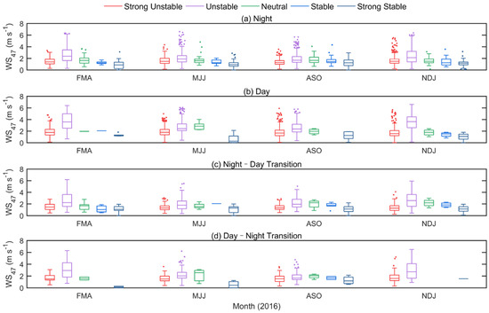 Box-and-whisker plots of wind speed at the 47 m level for each stability regime in different seasons and episodes, Night (a), Day (b), Night–Day transition (c) and Day–Night transition (d). The top, middle, and bottom horizontal lines of the box represent the 75th percentile, median, and 25th percentile, respectively.