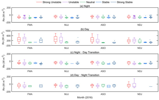Box-and-whisker plots of net radiation Rn at the 47 m level for each stability regime in different seasons and episodes, Night (a), Day (b), Night–Day transition (c) and Day–Night transition (d). The top, middle, and bottom horizontal lines of the box represent the 75th percentile, median, and 25th percentile, respectively.