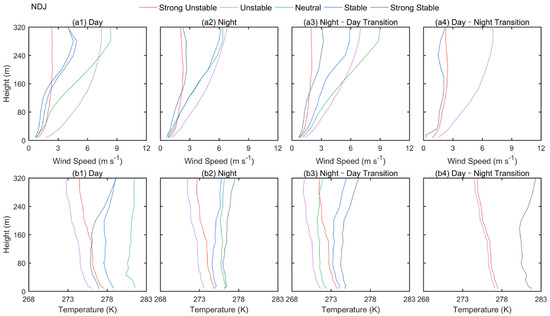 Averaged vertical profiles of wind speed at different episodes, Day (a1), Night (a2), Night–Day transition (a3) and Day–Night transition (a4), and air temperature, Day (b1), Night (b2), Night–Day transition (b3) and Day–Night transition (b4) for each stability regime in winter, 2016.