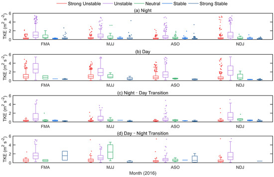 Box-and-whisker plots of turbulence kinetic energy (TKE) at the 47 m level for each stability regime in different seasons and episodes, Night (a), Day (b), Night–Day transition (c) and Day–Night transition (d). The top, middle, and bottom horizontal lines of the box represent the 75th percentile, median, and 25th percentile, respectively.